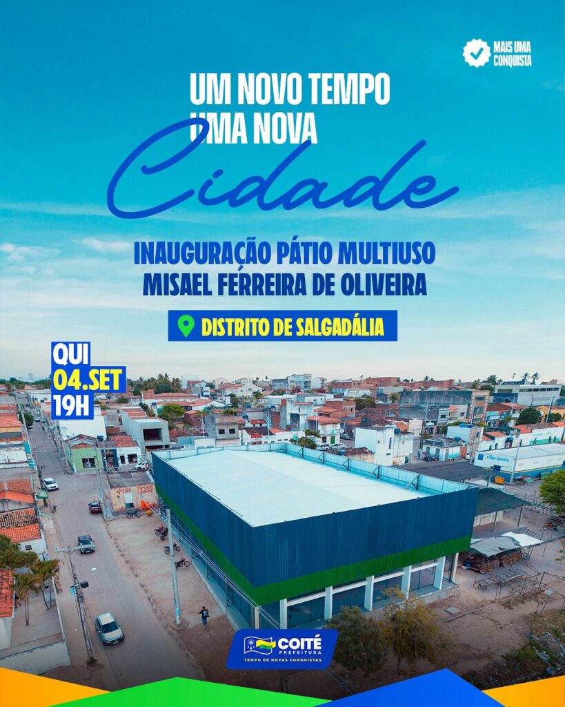 A prefeitura de Coité cumprindo o programa de inauguração de obras, convida a todos para comparecer com suas presenças nesta quinta-feira (04), às 19h, será inaugurado o Pátio Multiuso Misael Ferreira de Oliveira, no distrito de Salgadália.