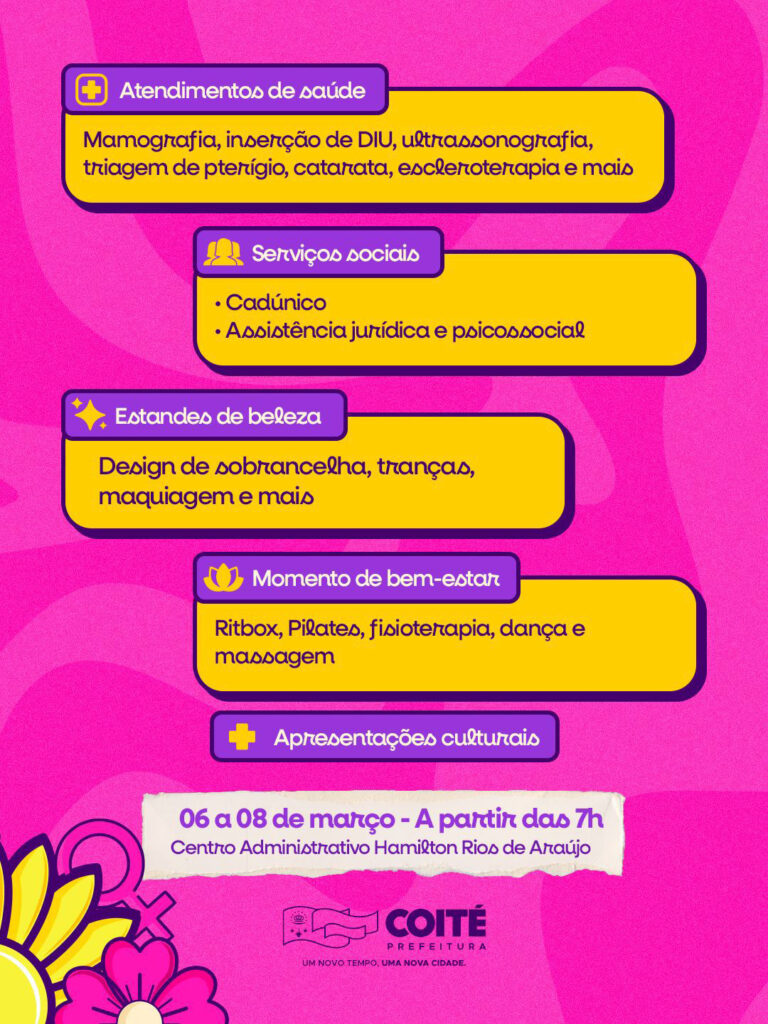 A Prefeitura de Conceição do Coité realiza, entre os dias 6 e 8 de março, uma grande ação integrada em alusão ao Dia Internacional da Mulher. O evento Elas em Movimento acontecerá na Praça do Centro Administrativo Hamilton Rios de Araújo, com início às 07h, e vai oferecer mais de mil vagas em atendimentos gratuitos, reunindo mais de 20 serviços nas áreas de saúde, assistência social, bem-estar, beleza e cultura.