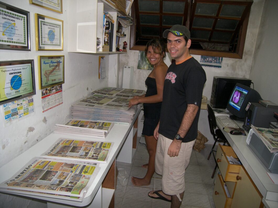 Geisa Oliveira no trabalho de dobragem do jornal impresso e Rennier Mascarenhas, filho do Diretor do Jornal Mário Silva
